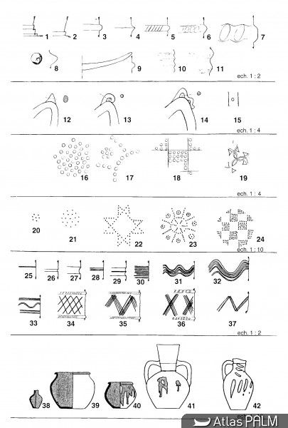 Parmi les objets céramiques, il faut signaler l’existence d’objets originaux : un tambour identique aux « derbuka » actuelles du Maghreb, une gourde aplatie, une lampe circulaire dotée de sept godets verticaux et un récipient zoomorphe et glaçuré qui demeure énigmatique, tant par sa représentation (girafe ? dromadaire ?) que par sa fonction (ustensile pour verser l’huile dans les lampes ? encrier ?).